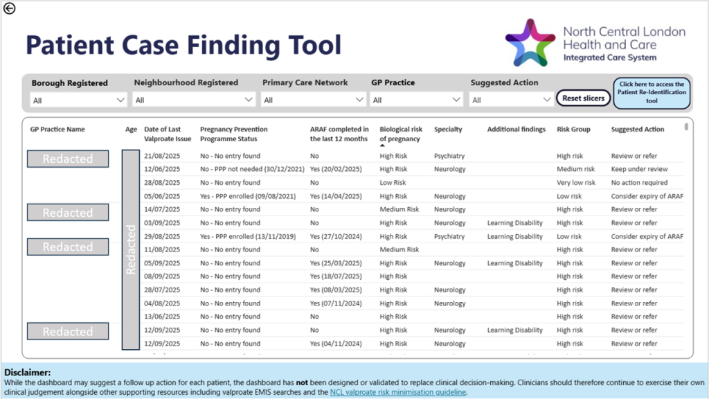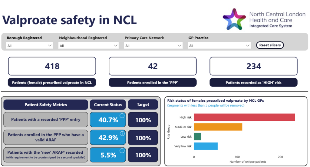 The valproate dashboard has proven to be a valuable clinical safety tool. It provides a centralised view of the adherence to the Pregnancy Prevention Programme and enables medicines management teams and GP practices to identify and support patients at risk, thereby providing an effective tool to identify gaps in care or coding.